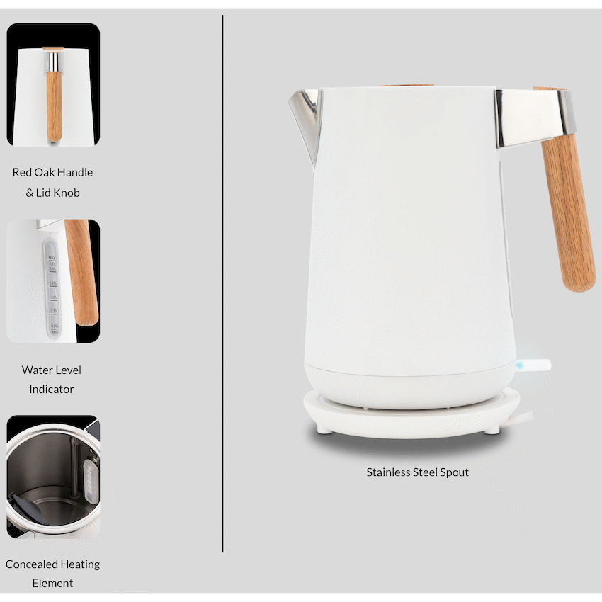 Bring warmth and elegance to your kitchen with the Boden Stark Anson Collection Kettle. Crafted with a genuine red oak handle and lid knob, and powered by a fast-boil 2000W heating element, it blends timeless design with modern functionality.