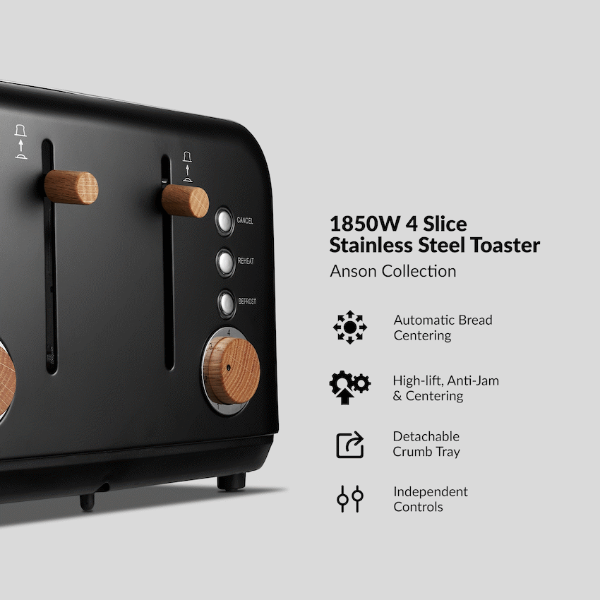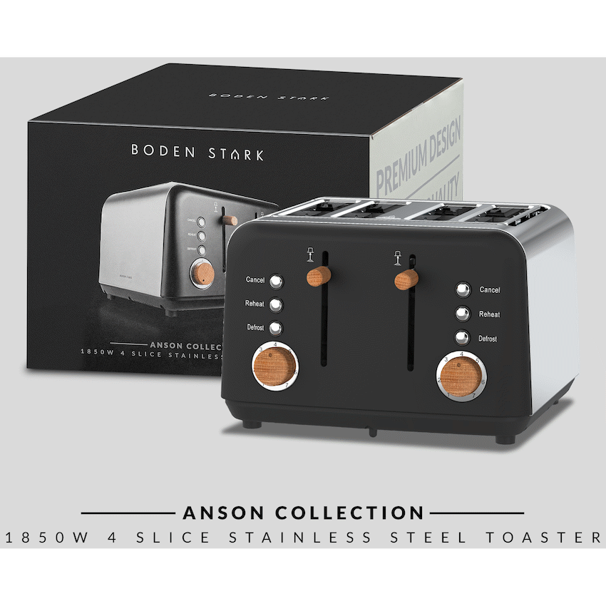 The Boden Stark Anson Collection Toaster blends natural elegance with everyday functionality. Featuring genuine red oak knobs, sleek stainless steel housing, and 7 browning levels, it offers the perfect balance of beauty and control — for toast done exactly your way.